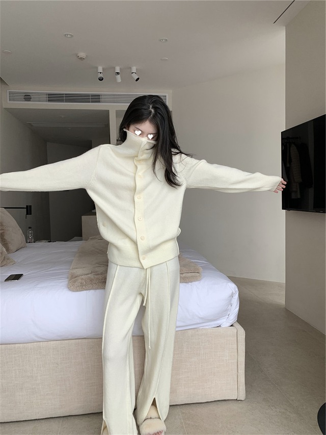ロングパンツ 柔らかい スリム ワイドパンツ セット デザインセンス ニットトップス カーディガン
