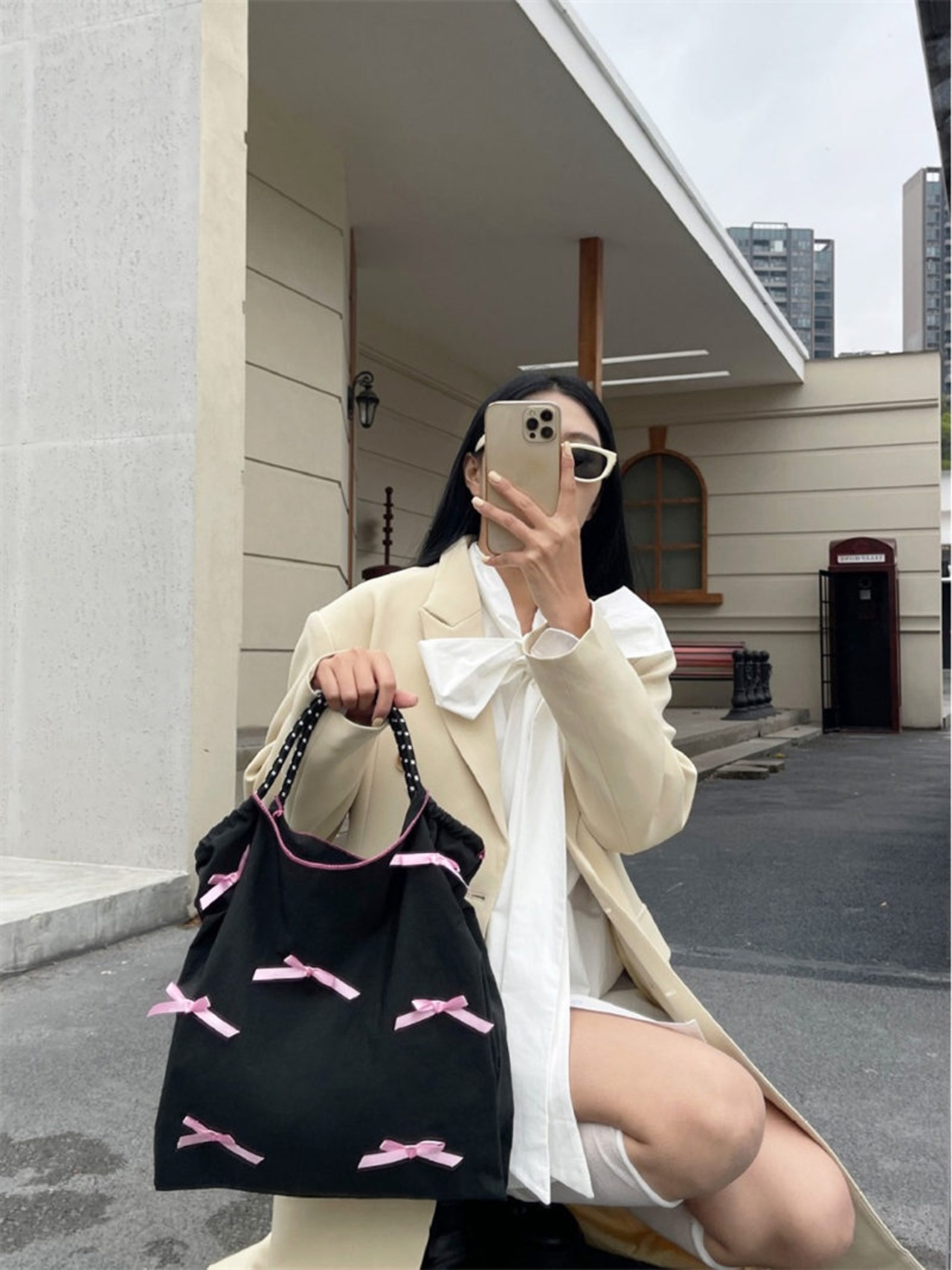このハンドバッグは、日常使いやお出かけにぴったり。コンパクトながらも収納力があり、使い勝手も抜群です。リボンデザインが女性らしさを引き立て、持つだけで気分も華やぎます。