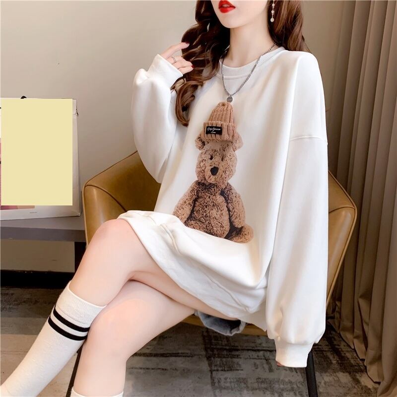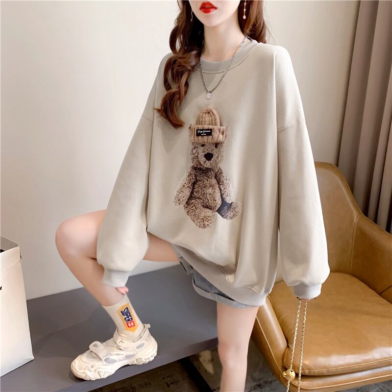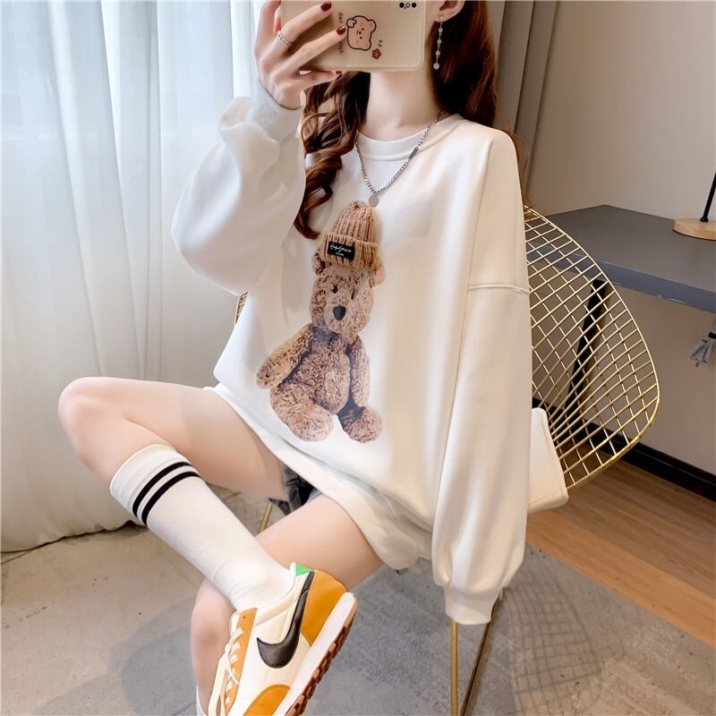 このトレーナーは、韓国風デザインの可愛らしい熊のプリントが目を引きます。暖かく、快適な着心地で、寒い季節に体をしっかり包み込んでくれる必需品です。